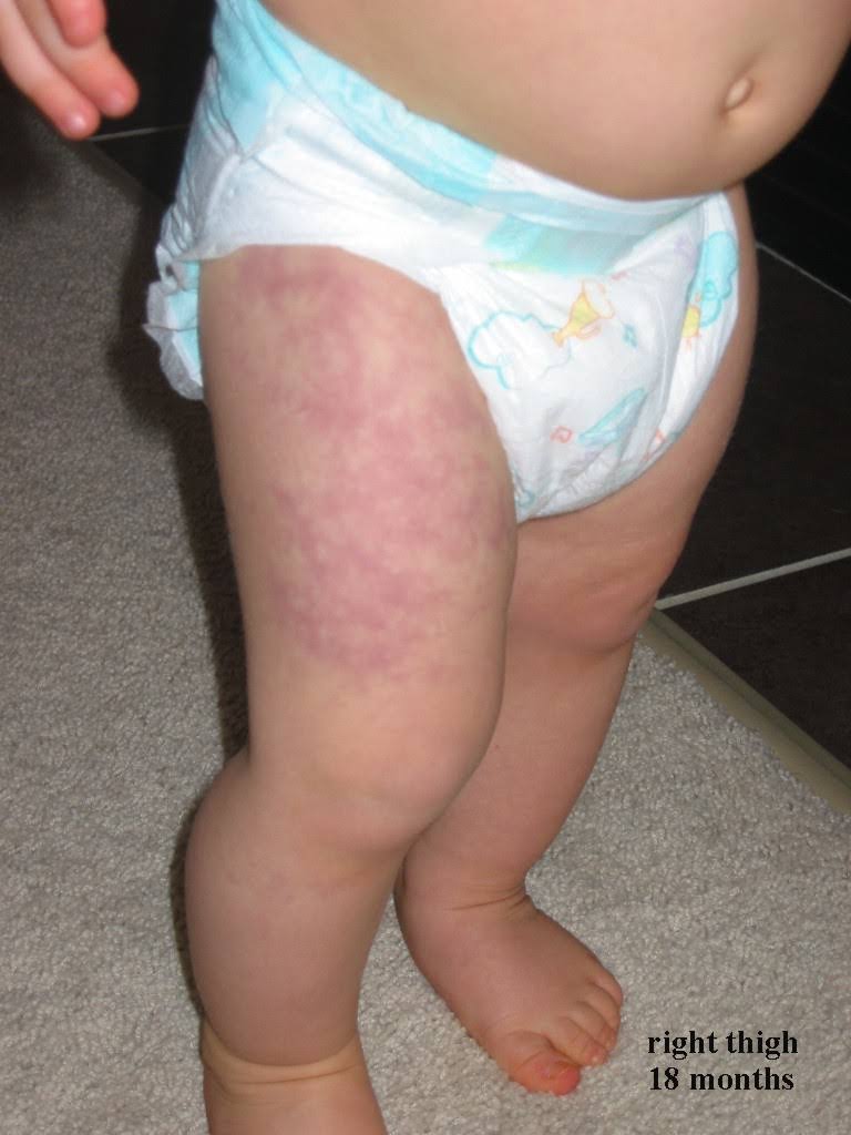 Bij de controle van zes weken, toen de “blauwe plekken” niet waren verdwenen, werden we doorverwezen naar een lokale kinderdermatoloog.